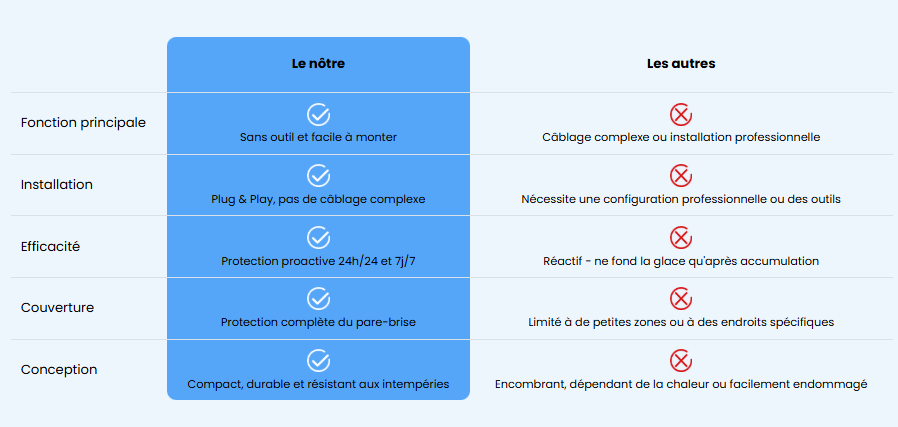 Prévient l'accumulation de glace tout au long de l'hiver et assure une visibilité dégagée chaque matin. Trajets plus sûrs, plus d'angles morts dus au givre tenace.